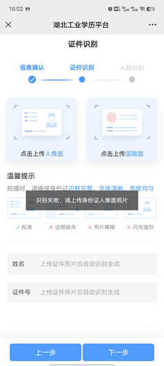 第六步:若身份证照片不符或不是本人身份证会提示错误无法上传